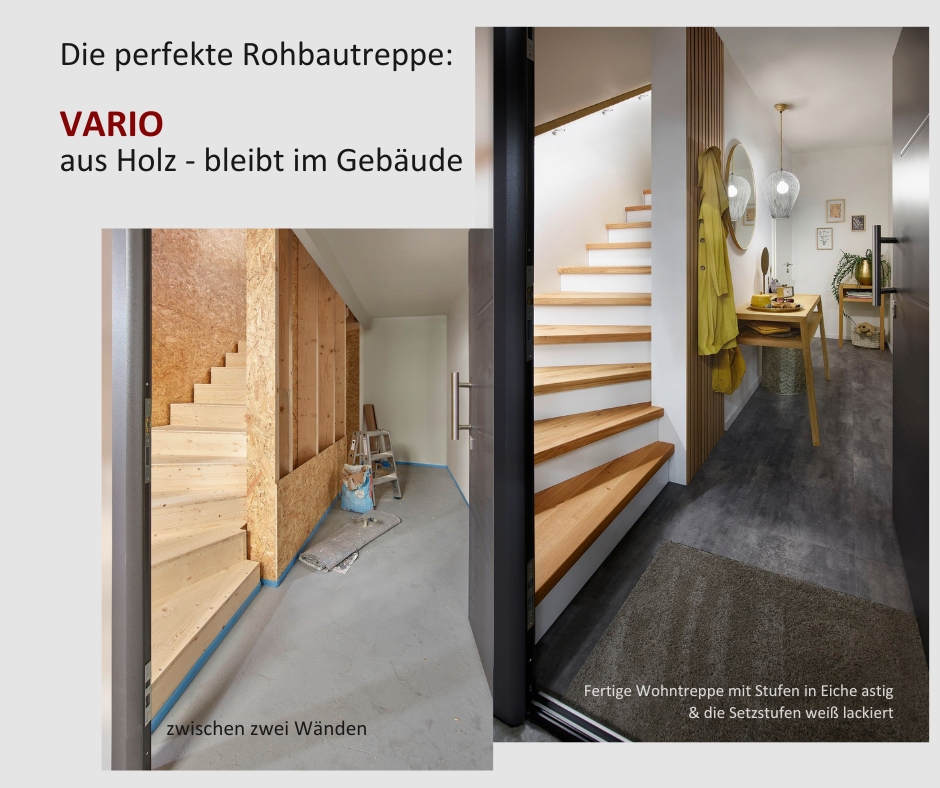 Die Rohbautreppe Vario von Treppenmeister wird ohne Kran montiert und ist in vielen Fällen schon vormontiert. Nach dem Einbau muss die Treppe für die individuelle Ausgestaltung nicht wieder abgebaut werden. Die Rohbautreppe bildet die Basis für Ihr perfektes Treppenhaus aus Holz.