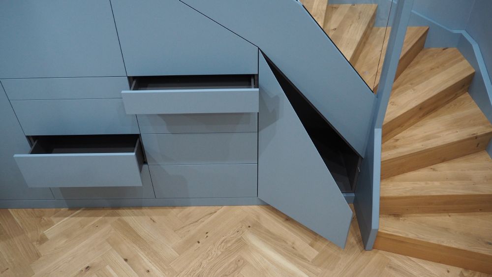 Bei offen sichtbaren Stufen erfordert die Gestaltung des Unterbereichs besondere Überlegungen. Ein geschlossener Schrank fügt sich oft nahtlos in das Gesamtbild ein und bietet maximale Diskretion. Ein individuell angefertigter Schrank aus Holz passt sich perfekt der Höhe und Breite der Treppenstufen an und nutzt jede Fläche vollständig aus.